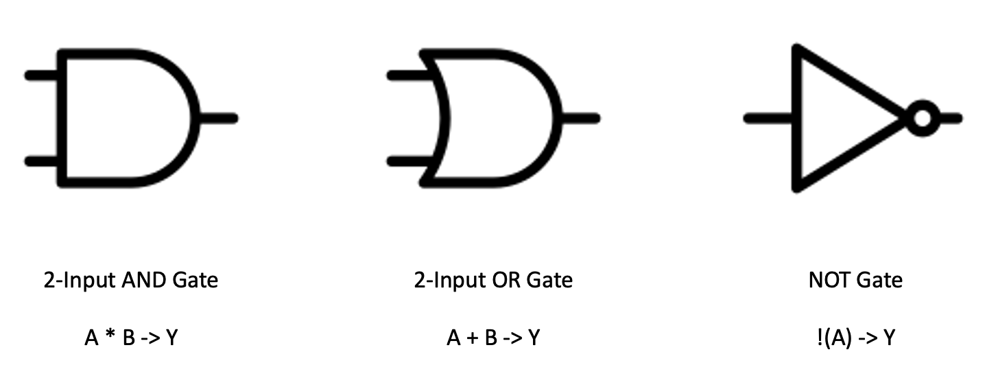디지털 로직에서도 "로직 게이트"라고 불리는 부품 또는 소자가 있습니다. 예를 들어, 아래 그림과 같이 AND, OR, NOT 게이트를 꼽을 수 있습니다. 그 외에 (XOR, NAND 등) 더 많은 유형의 게이트가 있지만, 저는 처음 언급한 3개만 따로 묶어서 '기초 논리 소자'라고 부릅니다. 이 소자들은 Boolean Algebra의 기본 연산자와 일대일로 대응됩니다. (이름도 똑같고 기능도 똑같습니다.) 2