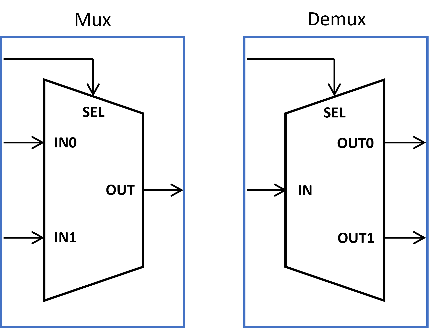 디지털 로직 중에도 선로전환기와 같은 역할을 하는 것이 있습니다. 바로, multiplexer와 demultiplexer입니다. 보통은 부르기 쉽게 mux, demux라고 합니다. 이 두 로직이 바로 '흐름제어' 유형에 해당됩니다. 기본적인 형태는 아래 그림과 같습니다.