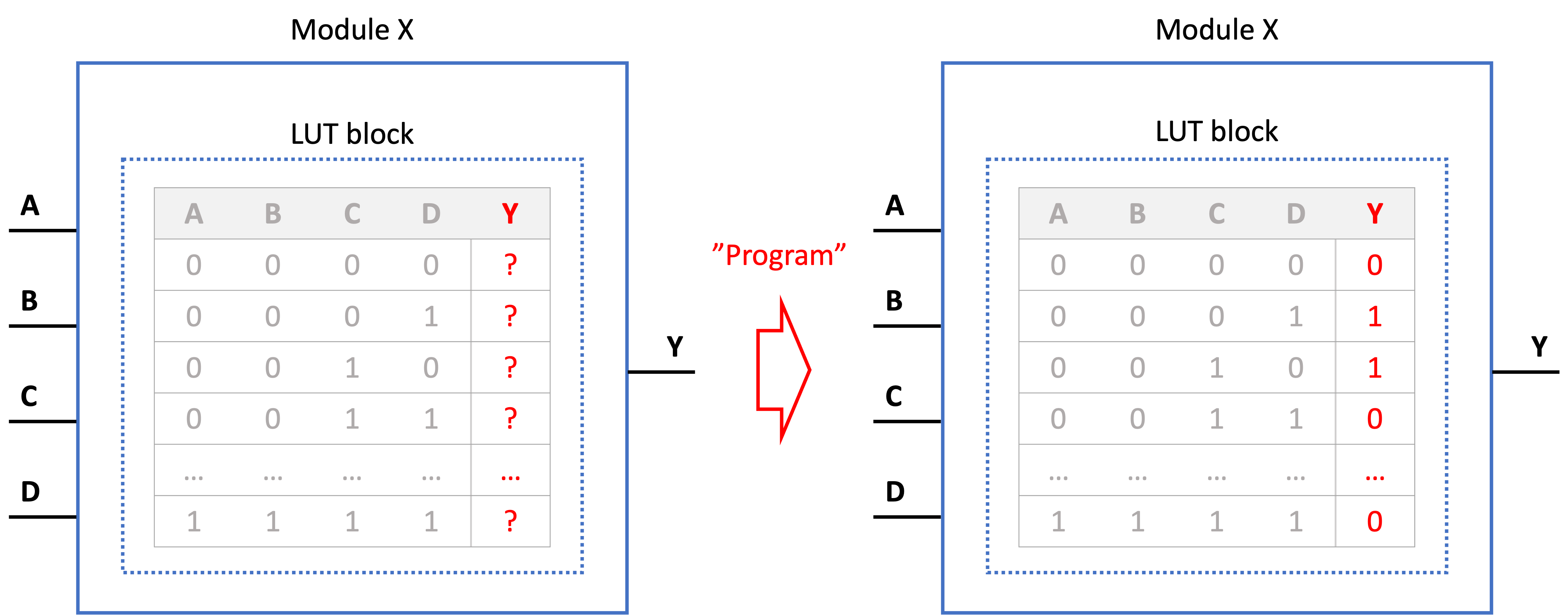 모듈 X 내부에는 아래 그림과 같이 LUT 블럭이 있습니다. 입력에 대한 모듈 X의 반응은 LUT 블럭에 적힌 내용에 따라 결정됩니다. 그림 오른쪽과 같이 LUT 블럭을 프로그램했다고 가정합시다. 그 후에 들어온 입력값이 0000이면, 이 모듈 X는 (LUT 블럭을 들여다 보고) 0을 출력할 것입니다. 그리고 입력값이 0001로 바뀐다면 출력값은 1로 바뀔 겁니다.