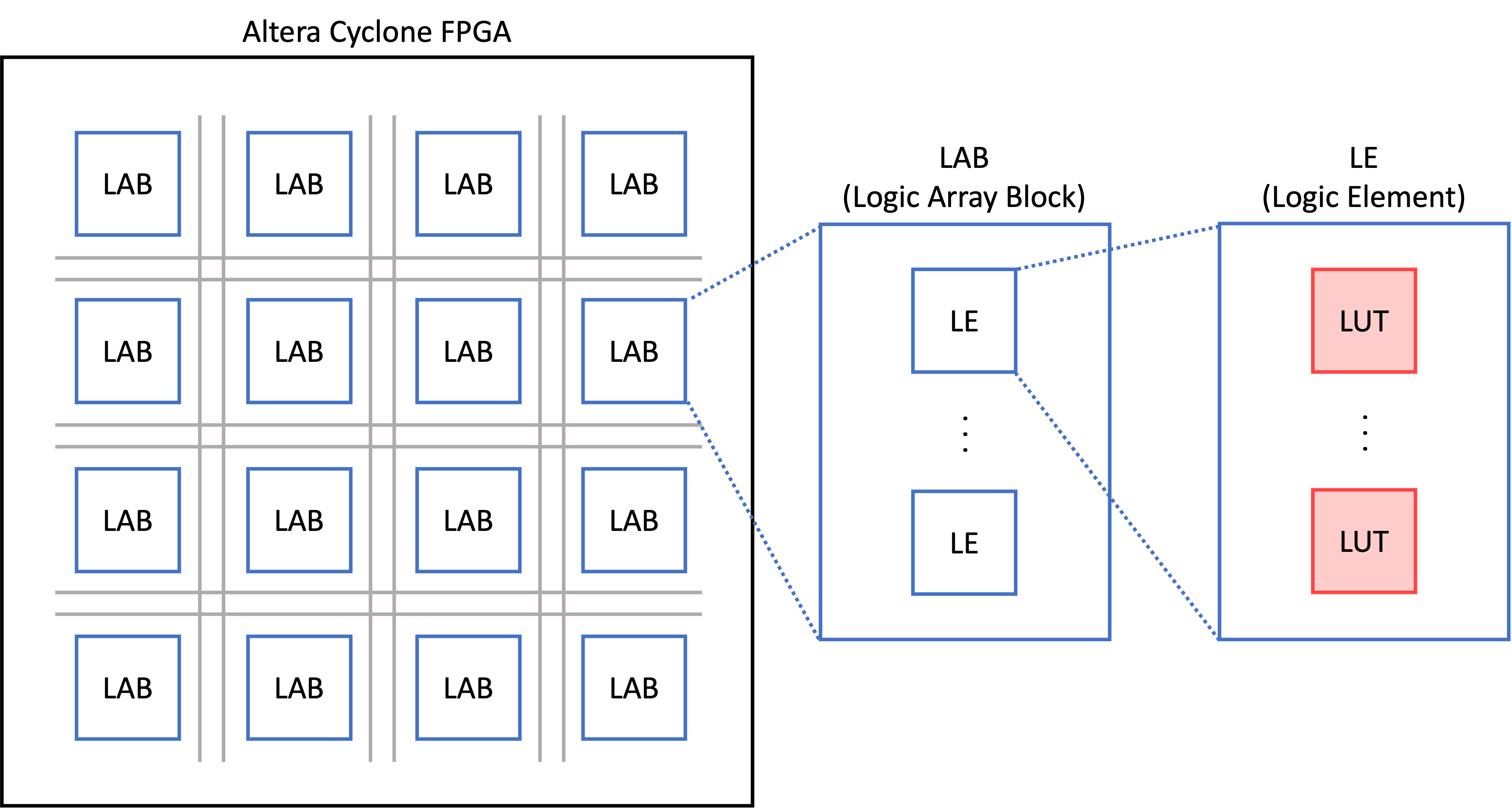 FPGA 내부에는 'logic array block (LAB)'라고 불리는 로직 블럭이 수없이 많이 깔려있습니다. (Altera FPGA 기준으로 설명하겠습니다. Xilinx에서는 Configurable logic block, 줄여서 CLB라고 부릅니다.) 이게 가장 큰 단위의 로직 블럭입니다. LAB 안에는 'Logic Element (LE)'라고 불리는 더 작은 로직 블럭이 여러 개 들어있습니다. (Xilinx에서는 Slice라는 블럭이 있습니다.) 그리고 LE 안에 LUT가 들어있습니다.